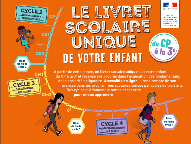 Un livret scolaire unique suit votre enfant depuis le CP, et jusqu’à la troisième. Il recense ses progrès dans l’acquisition des fondamentaux de la scolarité obligatoire.